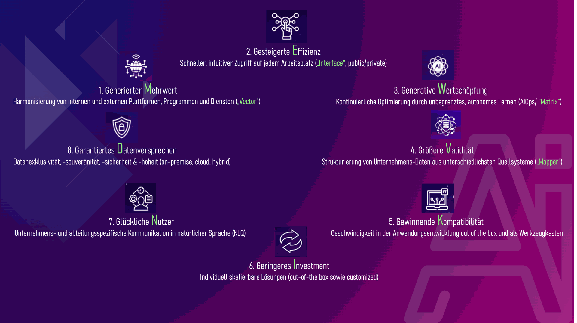 In Zeiten der digitalen Revolution repräsentiert unsere Produktreihe innerhalb der sich schnell entwickelten Landschaft der Deep Tech Technologien für Unternehmen das umfangreiche, dynamische Daten-Betriebssystem. Das Herzstück unseres leistungsstarken Ökosystems ist die hochmoderne eigenentwickelte Datenmanagement-Infrastruktur, konzipiert speziell für die Nutzung und Entwicklung von KI-optimierten Anwendungen. Durch die Konsolidierung unterschiedlichster Datenquellen in einem homogenen, KI-gesteuerten System lassen sich Datenverwaltung, Datenverfügbarkeit, Software- und Service-Anwendungen sowie KI-getriebene Innovationen nachhaltig harmonisieren, rationalisieren und optimieren.